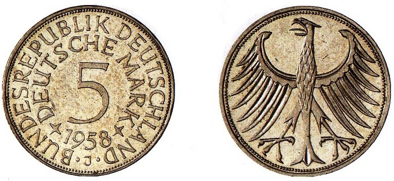 Das ist kurz gefasst die Vorgeschichte des bundesdeutschen Fünfmarkstücks, das von 1951 bis 2001 in zwei unterschiedlichen Metallen als Kurs- und Gedenkmünze hergestellt wurde. Dazu waren einige Vorbereitungen in der Gesetzgebung sowie hinsichtlich der Materialbeschaffung und der Gestaltung nötig. Bundesfinanzminister Fritz Schäffer schrieb am 9. Oktober 1950 auf eine Anfrage der damaligen Bundestagsfraktion Zentrum, vor kurzem sei ein Teil des zur Ausprägung der Münzen zu 5 DM nötigen Silbers in Mexiko gekauft worden. Ein weiterer Anteil werde gedeckt, "sobald die Alliierte Hohe Kommission Silbermünzen aus ehemals deutschen Beständen, die heute dem Bund gehören und auf Grund des Militärregierungsgesetzes Nr. 53 beschlagnahmt sind, freigibt." Die endgültige Entscheidung über die Gestaltung des Münzbildes für die Fünfmarkmünzen stehe der Bundesregierung nach § 6 des Gesetzes über die Ausprägung von Scheidemünzen vom 8. Juli 1950 zu. Der Bundesfinanzminister betont abschließend: "Zunächst müssen die Münzen zu 1 und 2 DM geprägt werden. Ich hoffe, die Prägung dieser Münzen bis zum Ablauf des Monats März 1951 durchführen zu können. Alsdann wird mit der Prägung der Münzen zu 5 DM begonnen werden. Die fertig gestellten Münzen kommen sofort in den Verkehr; im gleichen Umfang vermindert sich der Umlauf an Noten zu 5 DM." Bild 4 Fünfmarkprobe 1958 J